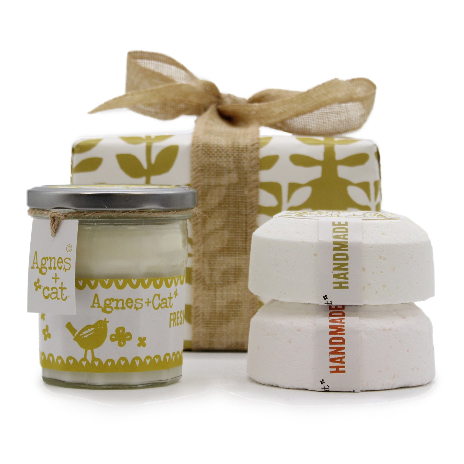 AGNES+CAT dovanų rinkinys, sojų žvakė ŠVIEŽIOS CITRUSINĖS SULTYS + 2 vonios bombos MAROKIETIŠKI RUTULIUKAI ir KLEMENTINAS